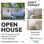 Don’t forget! Open house today from 2-5pm! This home has been completely renovated and is minutes from downtown Atlanta. For more info, call Donnie Fox at 678.643.9777.